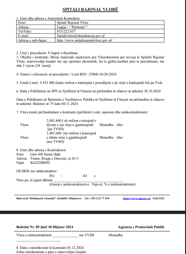 | Objekti i Tenderit | Blerje materiale mjekesore per viterektomine per nevoja te Spitalit Rajonal Vlore | |||||||