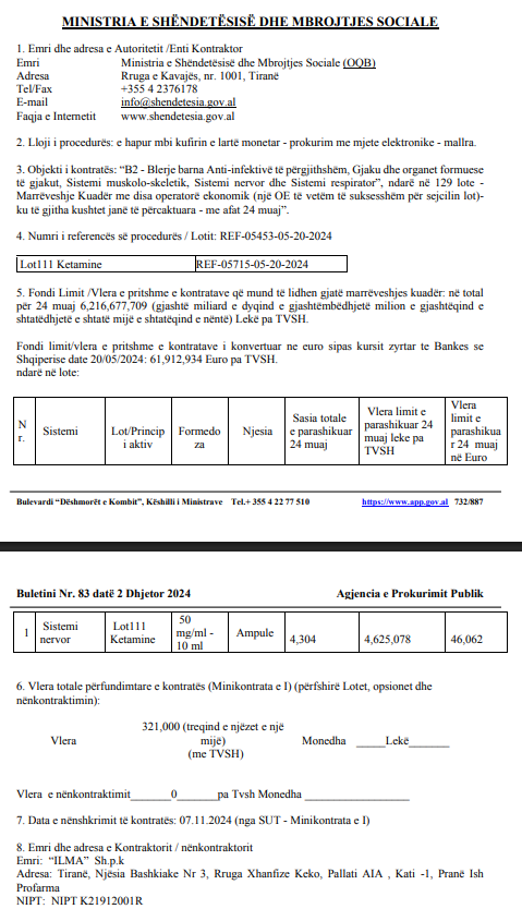 • Buletini i Prokurimeve Publike Kontrata te lidhura ne baze te Marreveshjes Kuader Ministria e Shëndetësisë REF-05715-05-20-2024