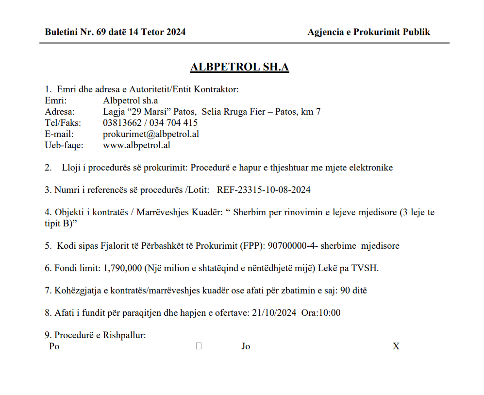| Autoritet Prokurues | Sh.A Albpetrol | Objekti i Tenderit | Shërbim per rinovimin e lejeve mjedisore (3 leje te tipit B) | |