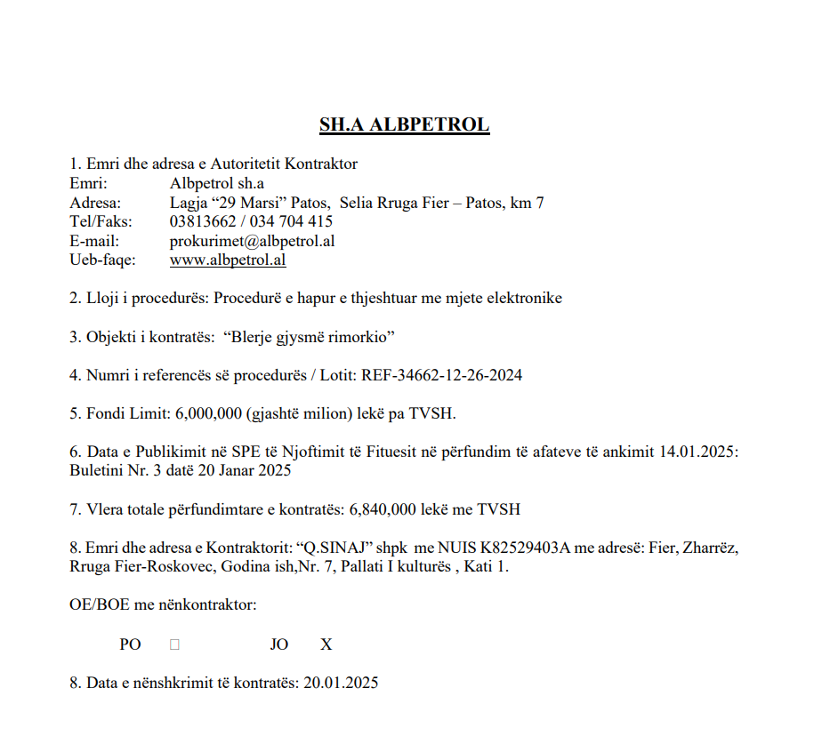 | Autoritet Prokurues | Sh.A Albpetrol | Objekti i Tenderit | Blerje gjysmë rimorkio | |