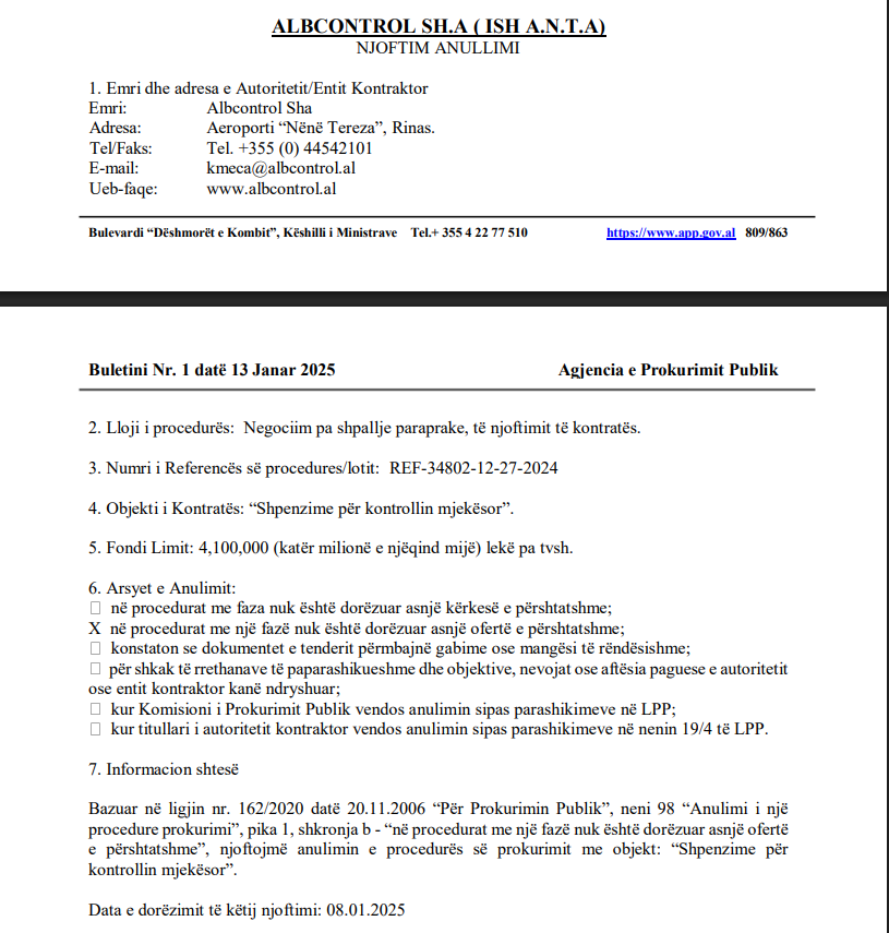 Njoftim anullimi Buletini Nr. 1 datë 13 Janar 2025 |