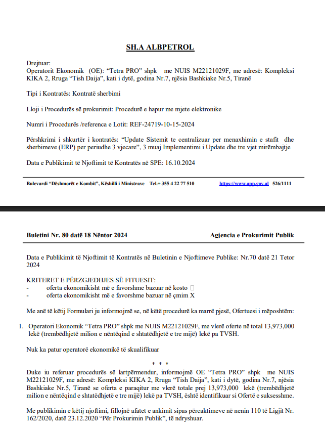 | Procuring Authority / Buyer | Tender object | Update Sistemit te centralizuar per menaxhimin e stafit dhe sherbimeve (ERP) per periudhe 3 vjecare | ||