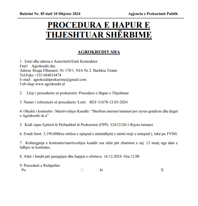 Tender object Sherbim internet/intranet per zyren qendrore dhe deget e Agrokredit sha
