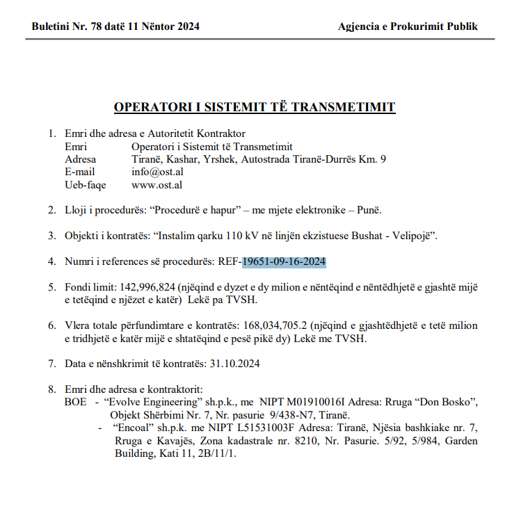 | Autoritet Prokurues | Operatori i Sistemit te Transmetimit OST | Objekti i Tenderit | Instalim qarku 110 kV në linjën ekzistuese Bushat - Velipojë | ||||
