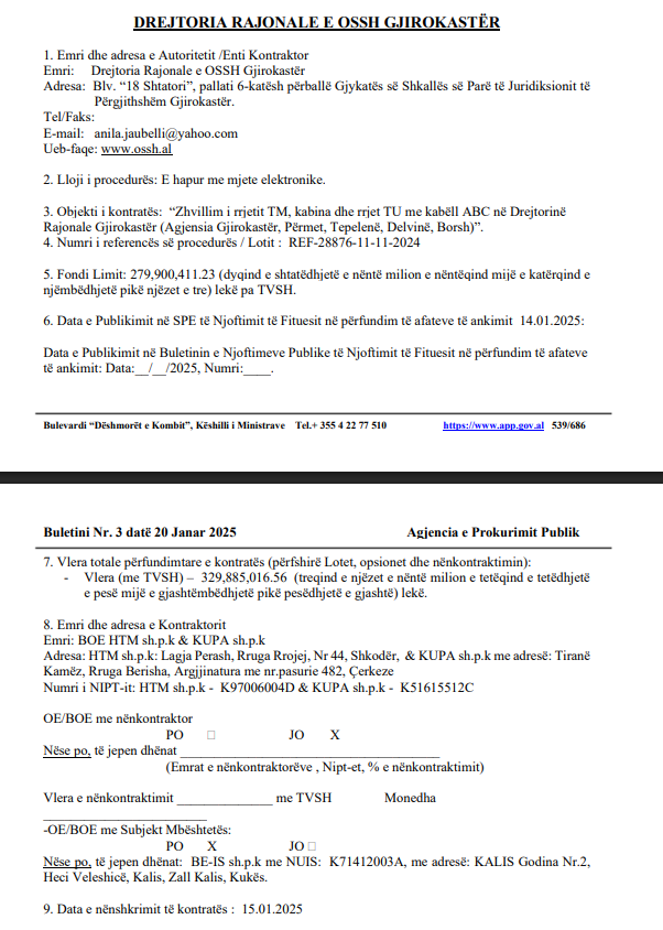 Njoftimi i Tenderit Buletini Nr. 80 datë 18 Nëntor 2024 Njoftim Fituesi Buletini Nr. 1 datë 13 Janar 2025 Njoftimi i Kontrates Buletini Nr. 3 datë 20 Janar 2025 |