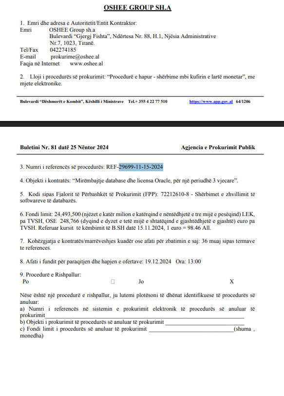 | Autoritet Prokurues | Operatori i Shperndarjes se Energjise Elektrike | Objekti i Tenderit | Mirëmbajtje database dhe licensa Oracle, për një periudhë 3 vjecare |
