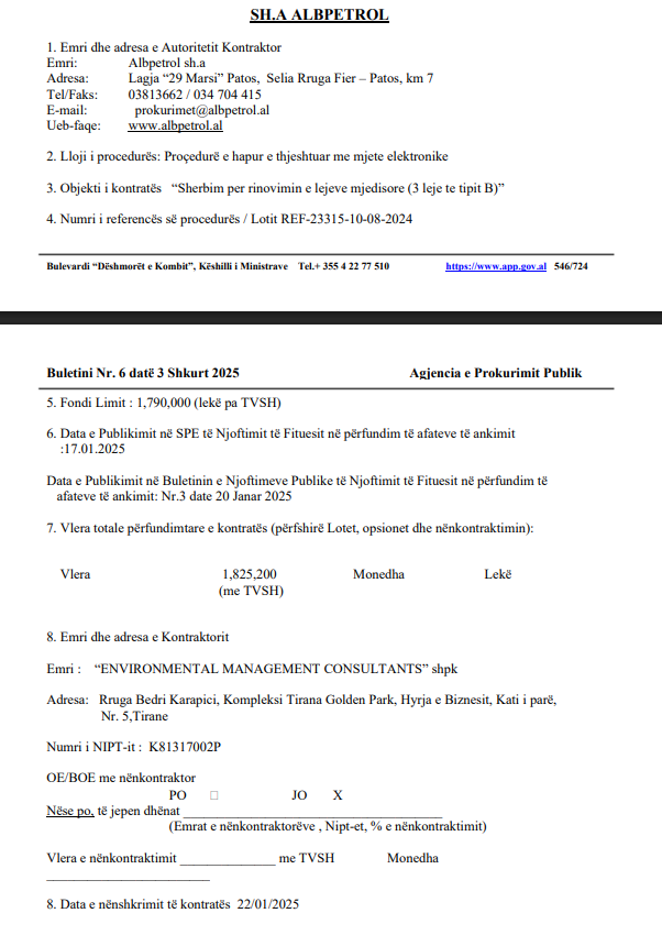 | Autoritet Prokurues | Sh.A Albpetrol | Objekti i Tenderit | Shërbim per rinovimin e lejeve mjedisore (3 leje te tipit B) | |